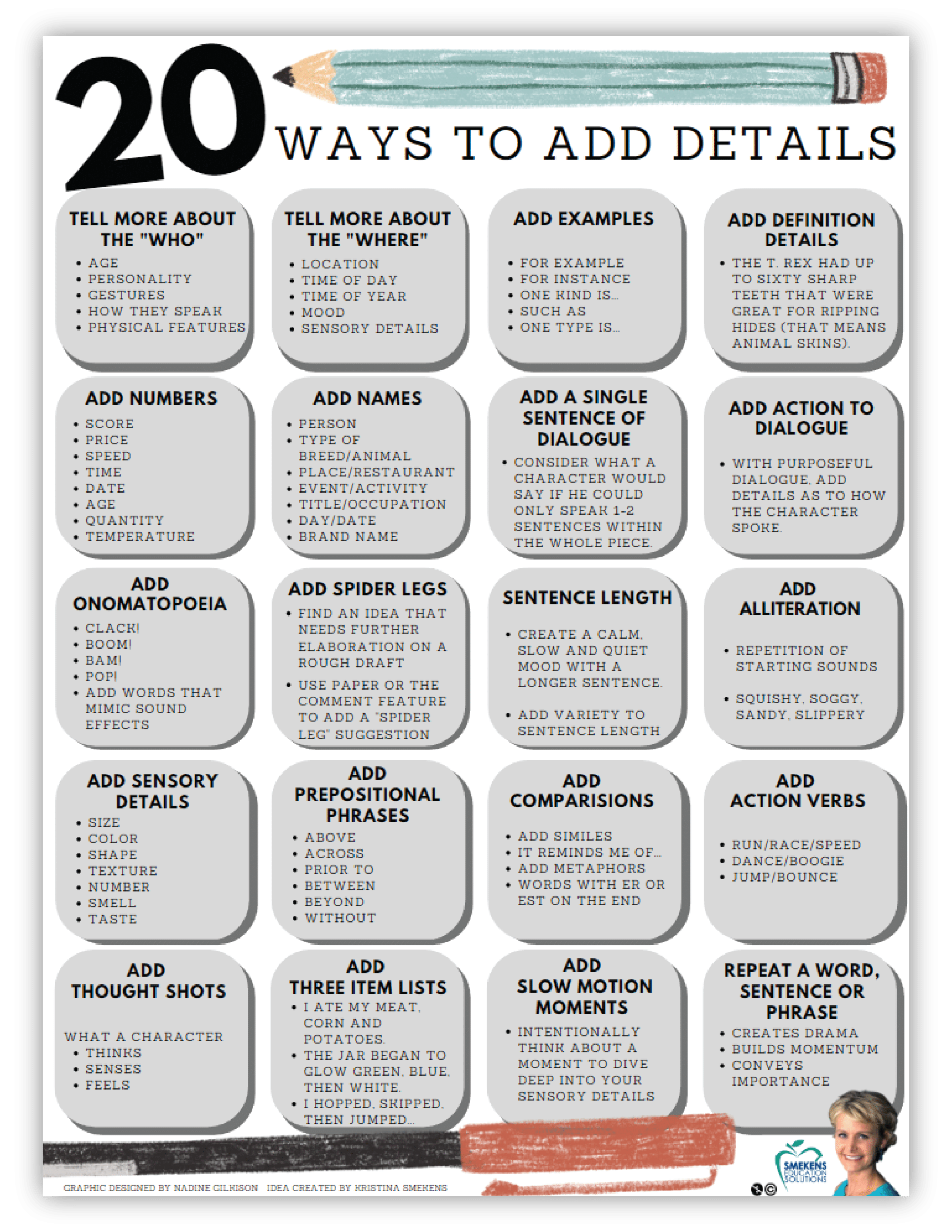 While introducing one strategy at a time, consider building a wall chart for these 20 ways to add details. This would provide a constant resource and reference within the classroom environment for the next couple of months.