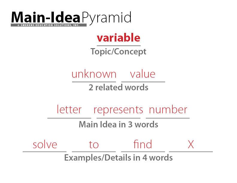 Main-Idea Pyramids are the most universal type because they can be used with big and broad concepts and specific vocabulary terms. These pyramids focus on the concept’s definition with a couple of key details.