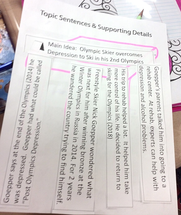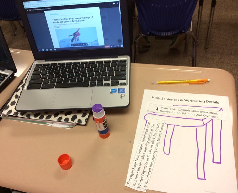 Bridget Longmeier, former Literacy Coach for Brown Elementary (Seymour, IN), used an article from Newsela on Olympic skier Nick Goepper to help her third grade students discern between supporting details and minor details. She used Smekens Education’s Table Top and Legs graphic organizer to show how supporting details hold up the main idea.
