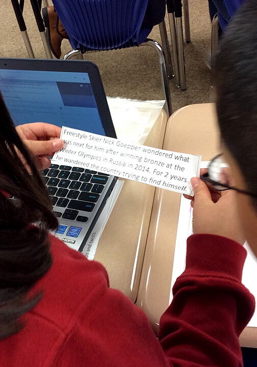 The article deals with the Olympian’s struggles after appearing in his first Olympics in 2014. It ends on a positive note about how after undergoing rehab, he returned to skiing to win silver in the 2018 Olympics. Bridget checked with the guidance counselor at her school to be sure the content was appropriate and was encouraged to include it in the lesson because of its positive outcome and message.