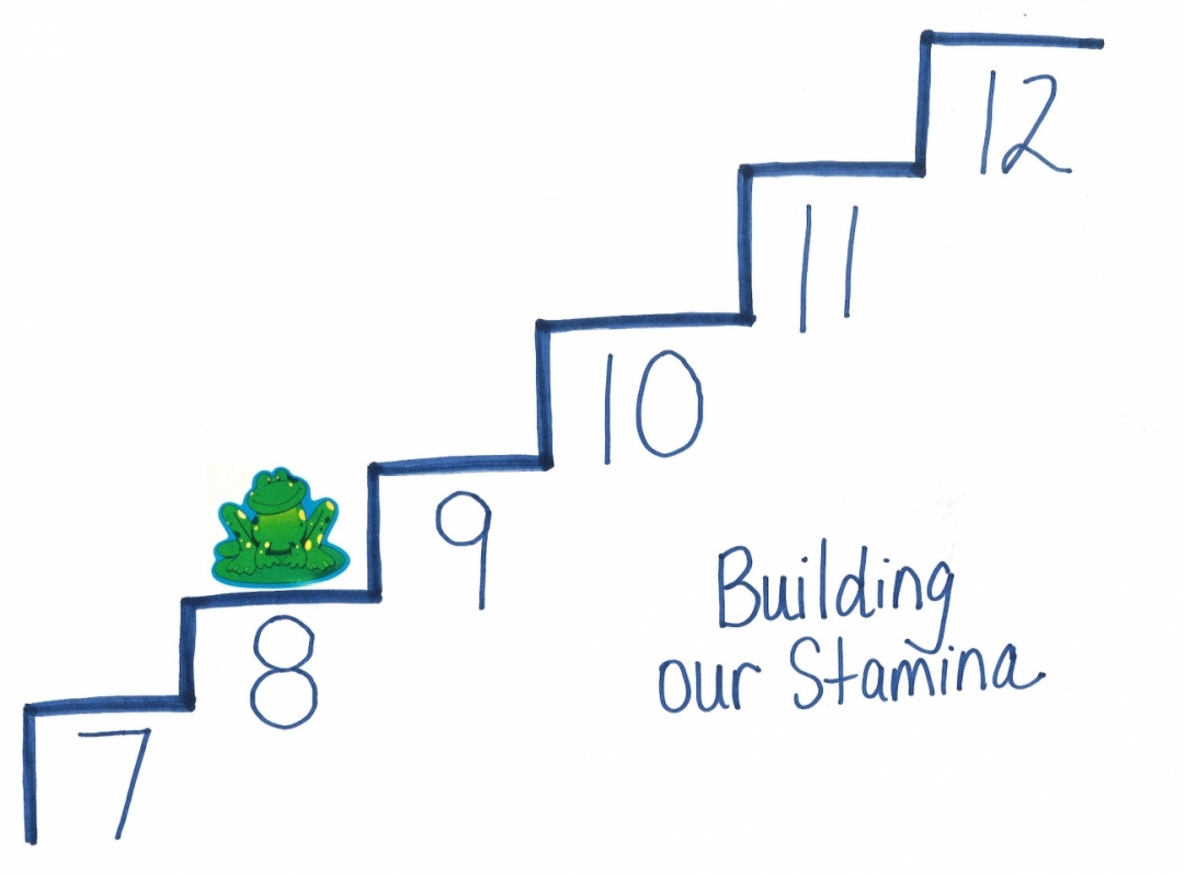Draw steps on a whiteboard or chart paper, labeling each step with a different increment of minutes. As students are able to work longer and longer, the teacher moves the “frog” up the steps to track students’ growing stamina.