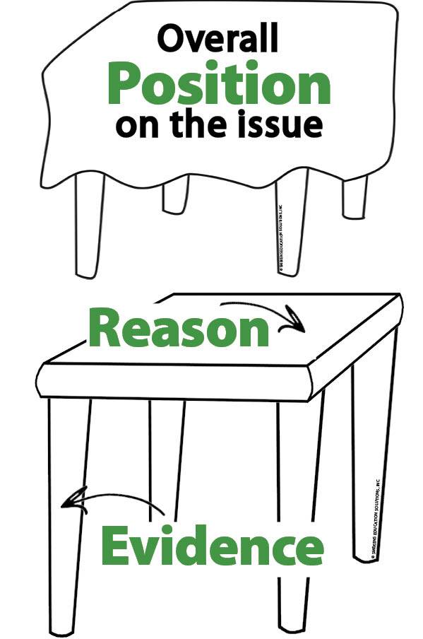 Since this is a K-12 expectation, recognize that all grade levels can use the same tables and legs analogy. However, the text (and the graphic organizer) should get more sophisticated as students progress from primary to intermediate grades. This includes going from a single reason to multiple reasons. This will require an organizer that includes several tables (i.e., multiple reasons) all under the same one tablecloth (i.e., position). And for middle and high school students, the text will likely also include a counterclaim.